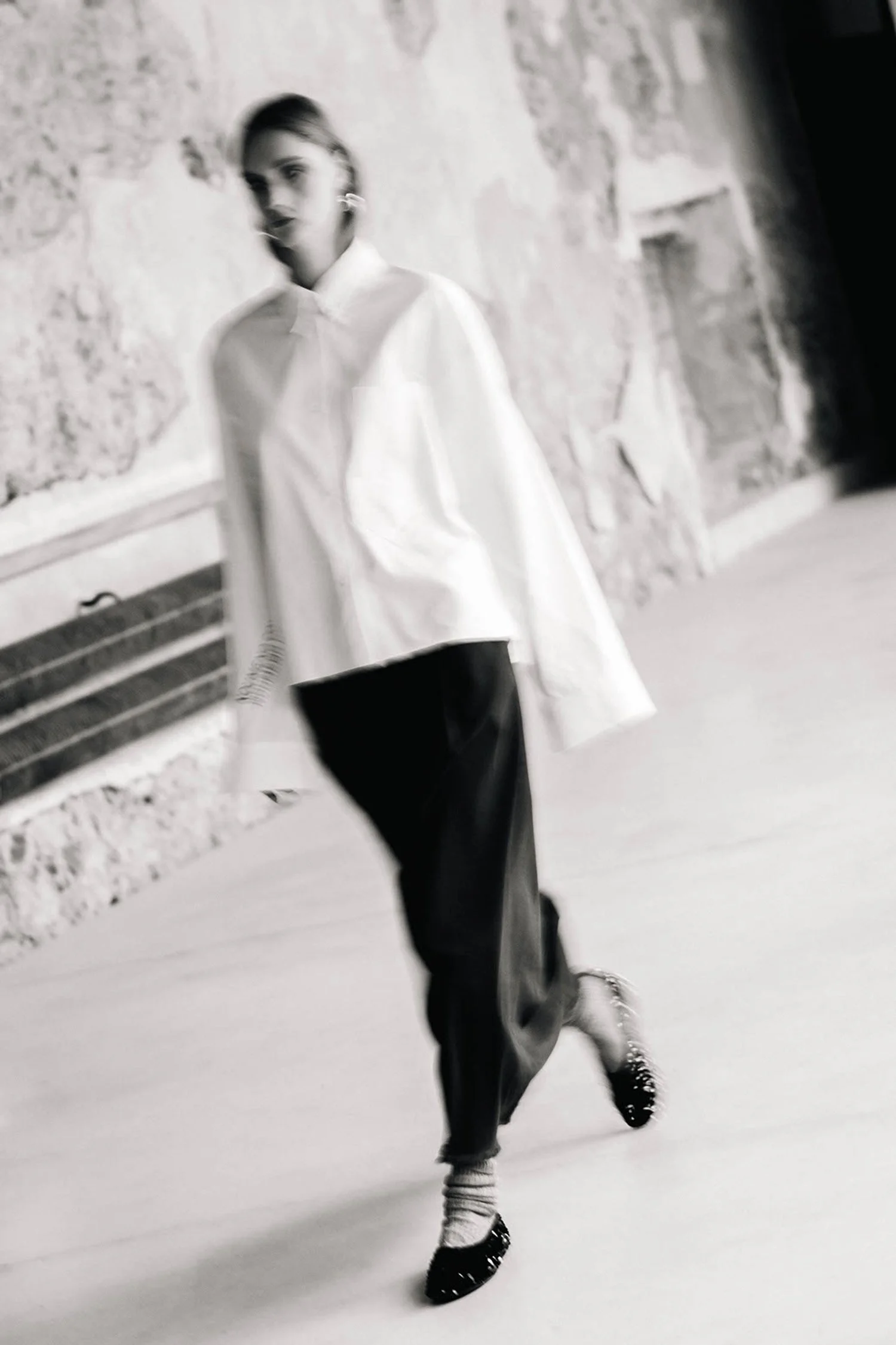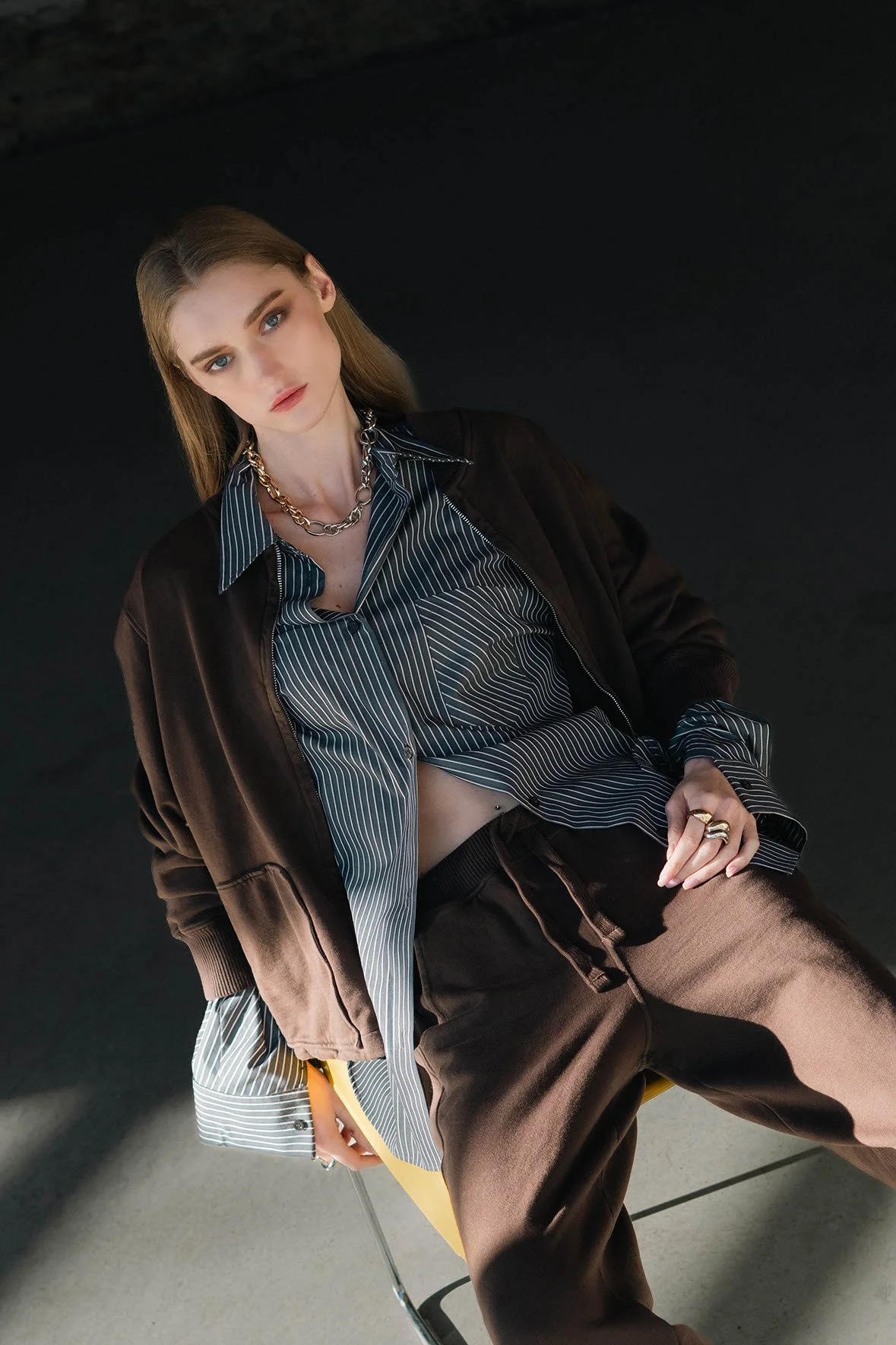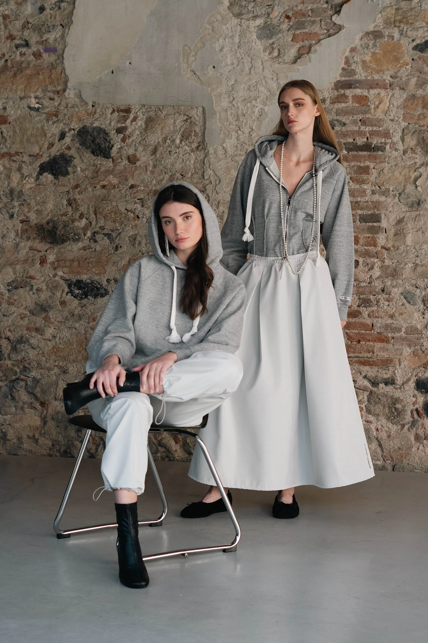 La nuova collezione AW25 è stata scattata negli spazi di Atipografia, galleria che diventa scenario e racconto, proprio come i nostri capi: pensati per essere vissuti, toccati, riconosciuti nel tempo. Il nostro punto di partenza è ancora una volta la felpa, cuore di Noumeno Concept. Questa stagione prende forma in pezzi esclusivi a edizione limitata, realizzati con una trama e un filato unici, ispirati alle tecniche degli anni ’70. Il tessuto speciale, con la sua delicata texture fiammata, restituisce un sofisticato tono grigio mélange. La ricerca negli archivi vintage ci ha riportati alle origini del fleece, riscoprendo il valore di questo filato straordinario e reimmaginandolo con uno sguardo contemporaneo e una femminilità nuova.